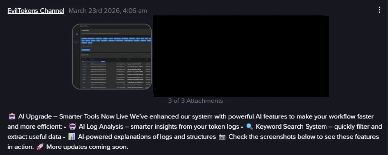 Figure 4: EvilTokens product update with announcement of integrated AI tooling