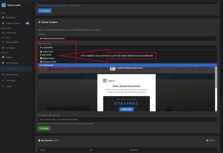 Figure 3: EvilTokens dashboard with custom branding options for phishing lures