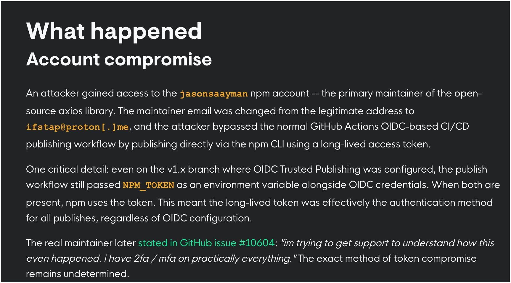 The axios npm supply chain compromise in March came to light as many security incidents do: a post on X in the middle of a Monday night.